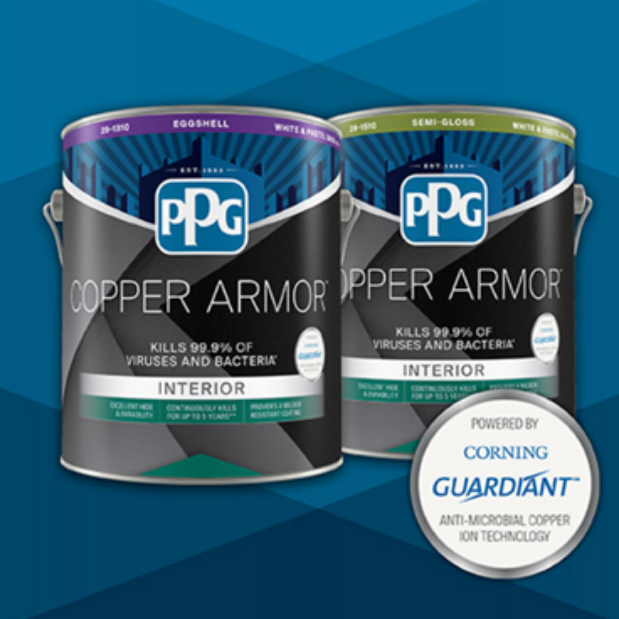 Powered by Corning® Guardiant® Anti-Microbial Copper Ion Technology, PPG COPPER ARMOR™ Interior Paint provides continuous protection on the painted surface, within 2 hours of exposure, from bacteria and viruses^ between cleaning and disinfecting. PPG COPPER ARMOR Interior Paint is EPA-Registered as an Anti-Viral & Anti-Bacterial paint that kills 99.9% of viruses and bacteria on the painted surface* by utilizing the intrinsic antimicrobial properties of copper to take an innovative non-chemical approach to killing bacteria and viruses. This product is now available in select locations. Please check the map to see if Copper Armor is available in your state.