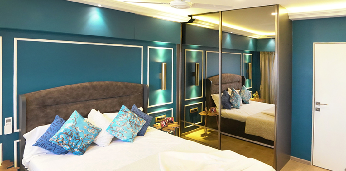 The master bedroom caters to luxury with the feeling of openness. The pastel green-coloured walls and the brass-and-wooden mouldings give out an elegant outlook. The mirror-finish ceiling-to-wall sliding wardrobe remains as the cynosure! While the brass displays by the window side and the slate-grey TV capsule lends an aesthetic look.