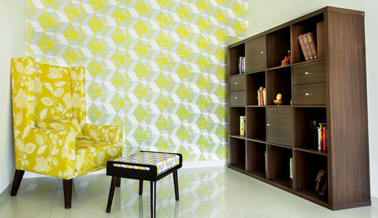 We turned an unused corner in the home into this sunny reading nook, with a fun, yellow wallpaper and matching armchair to relax in. The custom-made bookshelf has both open and closed shelf to store their books and other knick-knacks.
