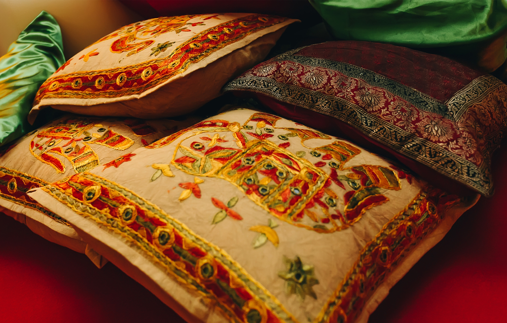 Fine embroidery is much appreciated, and seamstresses from Lucknow are known for their delicate stitches, and for the lovely weaving and dyeing of fabrics. Cushion covers with zardozi work, sequins, and mirror work are very popular, and floral motifs with intricately detailed leaves, creepers, trees, birds and animals are much loved in this region. Use these cushions and soft furnishings in the living and bedrooms to add a local touch to your décor.